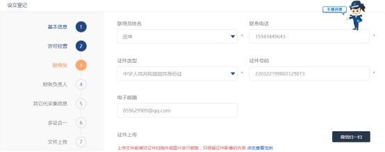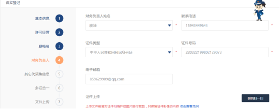 聯(lián)絡(luò)員信息填寫完畢后,會跳轉(zhuǎn)到填寫財務(wù)負責(zé)人的界面,如下圖: