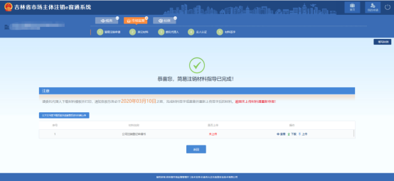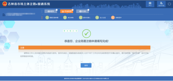 9、 做完實(shí)人認(rèn)證之后,跳轉(zhuǎn)到提交成功頁面,等待市監(jiān)人員審核即可,審核通過后方可繼續(xù)進(jìn)行簡(jiǎn)易注銷申請(qǐng),如圖: