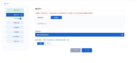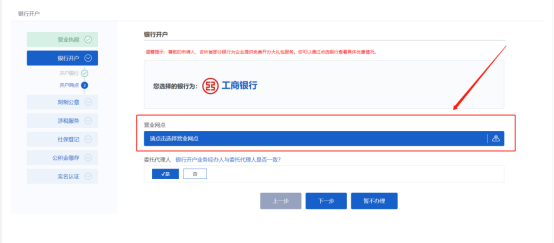 21) 選擇就近網(wǎng)點,雙擊后選擇銀行開戶業(yè)務(wù)經(jīng)辦人與委托代理人是否一致,如果一致直接點擊下一步進入刻制公章頁面,如不一致選擇“否”進入委托人頁面如下圖:
