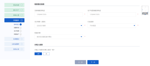 27) 點擊“下一步”進入稅務(wù)登記頁面如下圖完善信息后選擇辦稅人與委托代理人是否一致,如不一致選擇“否”進入委托人頁(見銀行開戶業(yè)務(wù)委托代理人)如一致點擊“下一步”進入發(fā)票申領(lǐng)頁面如下圖:
