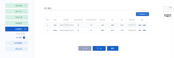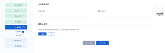 33) 完善信息后選擇辦理企業(yè)參保的經(jīng)辦人與委托代理人是否一致,如不一致選擇“否”進入委托人頁(見銀行開戶業(yè)務(wù)委托代理人)如一致點擊“下一步”進入員工登記頁面,如下圖: