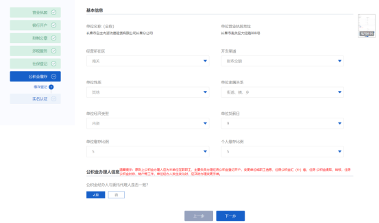 35) 完善信息后選擇公積金經(jīng)辦人與委托代理人是否一致,如不一致選擇“否”進入委托人頁(見銀行開戶業(yè)務(wù)委托代理人)如一致點擊“下一步”進入企業(yè)開辦領(lǐng)取信息頁,如下圖: