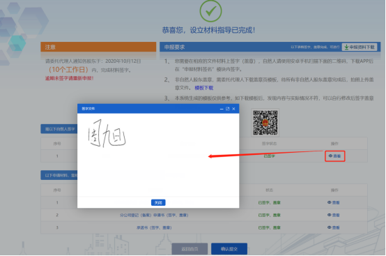 42) 待工商審核人員材料指導(dǎo)通過后,通過點擊我的申請中“簽字查看”進入簽字和上傳材料頁面如下圖: