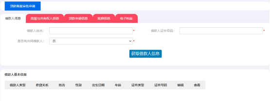 1、第一個(gè)頁簽【借款人信息】里,經(jīng)辦人需要根據(jù)借款人是否已婚錄入借款人信息頁簽的對應(yīng)信息,未婚的主借人錄入借款人姓名和證件號(hào)碼后點(diǎn)擊【獲取借款人信息】;已婚的主借人在【是否有共同借款人】選項(xiàng)處選擇是后錄入共同借款人姓名和證件號(hào)碼再點(diǎn)擊【獲取借款人信息】,下方列表會(huì)展示錄入的借款人信息