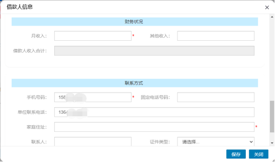 經(jīng)辦人需要補(bǔ)充借款人的必填信息如【婚姻狀況】、【職業(yè)】、【戶口簿地址】、【郵政編碼】、【單位性質(zhì)】、【月收入】、【手機(jī)號(hào)碼】、【家庭住址】等,其他非必填項(xiàng)按真實(shí)情況酌情錄入,信息編輯完畢后點(diǎn)擊【保存】即可(月收入為借款人的繳存基數(shù))