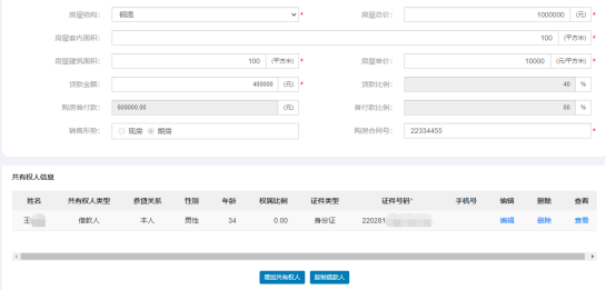項(xiàng)目協(xié)議號(hào)錄入后自動(dòng)回顯該協(xié)議相關(guān)協(xié)議信息,經(jīng)辦人繼續(xù)補(bǔ)充房屋的其他信息如【棟號(hào)】、【門牌號(hào)】,填寫【房屋總價(jià)】、【房屋套內(nèi)面積】、【房屋建筑面積】、【貸款金額】、【購房合同號(hào)】等必填字段,共有權(quán)人信息默認(rèn)自動(dòng)填充,可針對共有權(quán)人信息進(jìn)行【編輯】、【查看】、【刪除】