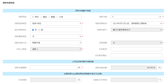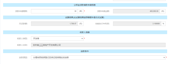 上方的貸款申請信息錄入后繼續(xù)在【貸款申請期限】處錄入申請年限,錄入后會(huì)在下方試算結(jié)果欄里顯示按照等額本息的還款方式試算出來的月還款額和執(zhí)行利率作為參考,【收款人】類型需要選擇開發(fā)商,選擇后收款人名稱自動(dòng)回顯為開發(fā)商名稱