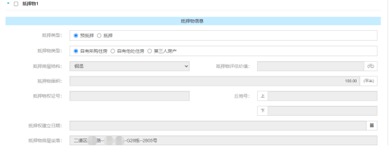 貸款申請信息錄入完畢后點(diǎn)擊左上角【抵押信息】頁簽補(bǔ)充抵押與保證信息,商品房期房類型的需要補(bǔ)充抵押與保證信息、現(xiàn)房類型需要補(bǔ)充抵押信息,點(diǎn)擊【增加抵押物】后默認(rèn)回顯抵押物即貸款房屋相關(guān)信息,相關(guān)信息均為回顯不需要改動(dòng)