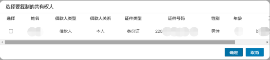 選擇【編輯】后在打開的共有權(quán)人信息頁簽里按實(shí)際情況補(bǔ)充共有權(quán)人信息,錄入完畢后點(diǎn)擊【確定】保存共有權(quán)人信息;若展示的共有權(quán)人實(shí)際不存在可點(diǎn)擊【刪除】將該條記錄刪除;可點(diǎn)擊【查看】核實(shí)已維護(hù)好的共有權(quán)人信息;若想添加除借款人以外的共有權(quán)人可點(diǎn)擊下方【添加共有權(quán)人】選項(xiàng)在打開的共有權(quán)人信息頁簽里手動(dòng)錄入;若誤刪已有的共有權(quán)人可點(diǎn)擊下方【復(fù)制借款人】選項(xiàng)自動(dòng)填充