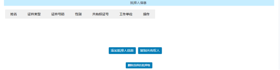 抵押物信息添加完畢后下方顯示抵押人信息欄,經(jīng)辦人需要維護(hù)相關(guān)抵押人,點(diǎn)擊【添加抵押人信息】在彈出的抵押人信息頁簽里手動(dòng)錄入相關(guān)信息;點(diǎn)擊【復(fù)制共有權(quán)人】自動(dòng)填充抵押人信息如下圖所示;若抵押物信息有誤可先勾選上方抵押物1方框再點(diǎn)擊【刪除選擇的抵押物】即可清空抵押物信息