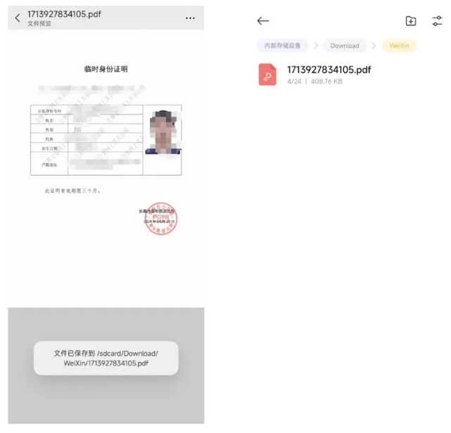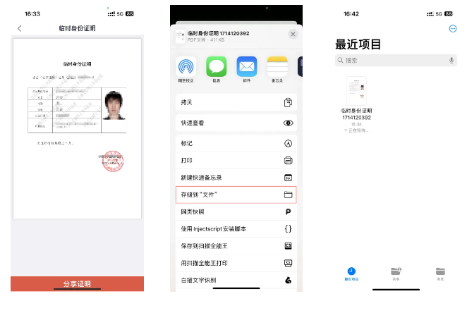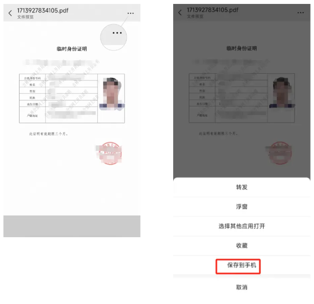 新版“吉事辦”的蘋果手機(jī)App、微信小程序和支付寶小程序與安卓手機(jī)App辦理流程相同,電子檔保存方法稍有不同。蘋果手機(jī)App點(diǎn)擊“分享證明”可進(jìn)行文件分享,點(diǎn)擊“存儲(chǔ)到文件”可將電子檔保存到本地。微信小程序和支付寶小程序可以點(diǎn)擊右上角“…”,選擇“轉(zhuǎn)發(fā)”和“保存到手機(jī)”。點(diǎn)擊“保存到手機(jī)”,根據(jù)保存時(shí)提示的路徑即可查找到保存的“臨時(shí)身份證明”。