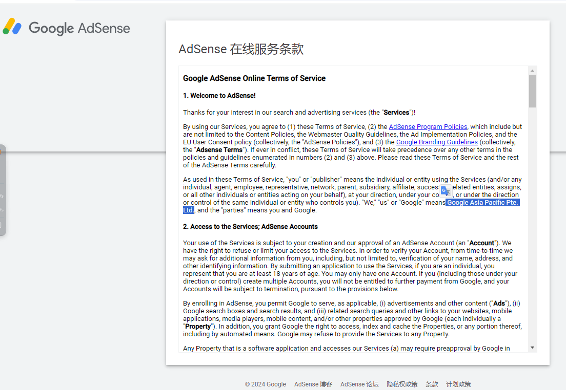在這里我要著重強(qiáng)調(diào)的是,大家點(diǎn)擊自己賬號(hào)頁(yè)面底部的《條款》,應(yīng)該所有的中國(guó)用戶應(yīng)該都是谷歌新加坡公司即“ Google Asia Pacific Pte. Ltd.”,我下圖中的選中后的藍(lán)色部分。
