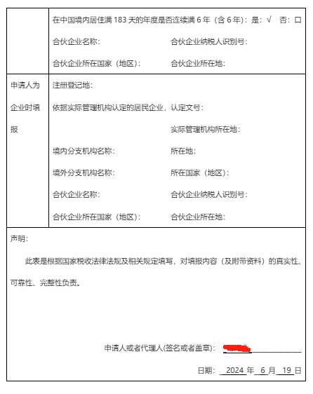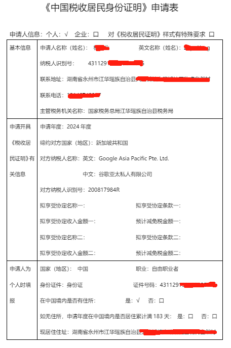 既然明確了合同的簽約的主體是Google Asia Pacific Pte. Ltd.在填寫(xiě)《〈中國(guó)稅收居民身份證明〉申請(qǐng)表》的時(shí)候,下面資料需要正確填寫(xiě):