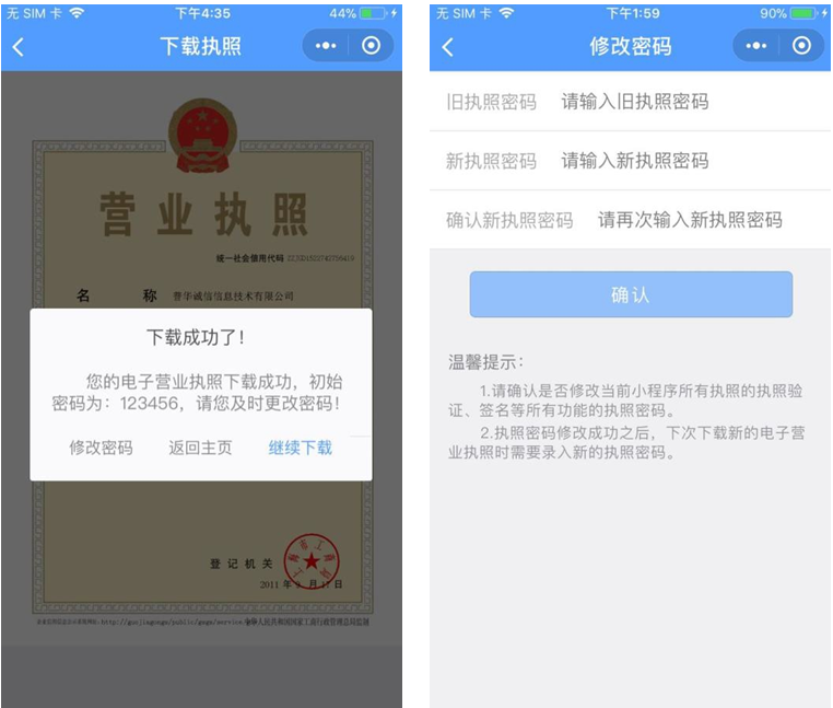 - 如果在下載電子,需要閱讀《執(zhí)照下載聲明》。如果本 APP 上有多個(gè)執(zhí) 照并且修改過密碼,下載時(shí)需要輸入修改后的密碼。