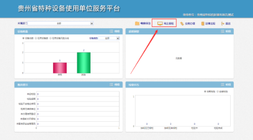 系統(tǒng)首頁(yè)以圖表的形式對(duì)設(shè)備數(shù)量、超期預(yù)警、整改提示、檢驗(yàn)狀態(tài)進(jìn)行統(tǒng)計(jì)分析;菜單欄包含:電梯保險(xiǎn)、網(wǎng)上報(bào)檢、業(yè)務(wù)辦理、法律法規(guī),進(jìn)行電梯檢測(cè)網(wǎng)上報(bào)檢請(qǐng)點(diǎn)擊“網(wǎng)上報(bào)檢”菜單。如下圖所示: