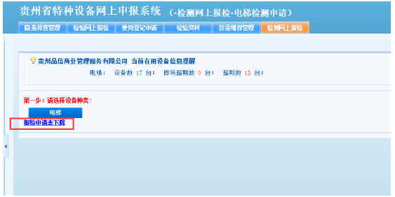 進(jìn)入“網(wǎng)上報(bào)檢”詳情頁(yè)面后,請(qǐng)點(diǎn)擊菜單欄上的“檢測(cè)網(wǎng)上報(bào)檢”菜單進(jìn)行電梯檢測(cè)申請(qǐng)和電梯檢測(cè)查詢。如下圖所示: