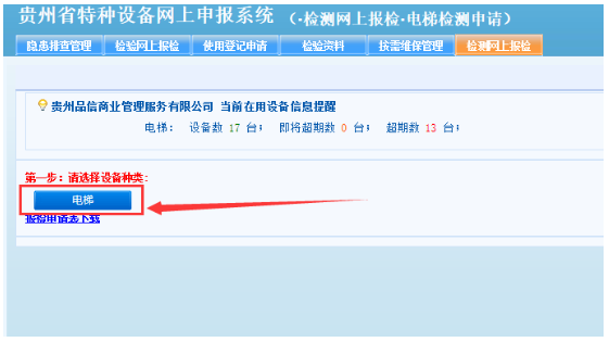 點(diǎn)擊“檢測(cè)網(wǎng)上”菜單默認(rèn)展示“電梯檢測(cè)申請(qǐng)”的詳情頁(yè)面,頁(yè)面上展示當(dāng)前在用電梯設(shè)備的數(shù)量、即將超期和超期的設(shè)備數(shù)量,點(diǎn)擊對(duì)應(yīng)的數(shù)字可查看詳細(xì)的設(shè)備列表明細(xì);電梯檢測(cè)申請(qǐng)主要分為三步,分別為:選擇設(shè)備種類、選擇報(bào)檢設(shè)備、填寫報(bào)檢信息。如下圖所示: