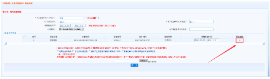 2)核對(duì)申報(bào)業(yè)務(wù)列表的設(shè)備信息并填寫預(yù)期檢測(cè)時(shí)間,如所選擇的設(shè)備不想在本次進(jìn)行報(bào)檢,可點(diǎn)擊項(xiàng)目刪除列上的“刪除”按鈕移除對(duì)應(yīng)的設(shè)備。如下圖所示: