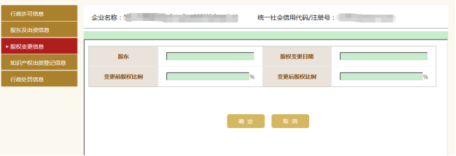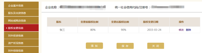 錄入股東姓名、變更前股權比例、變更后股權比例、股權變更日期等信息,如圖: