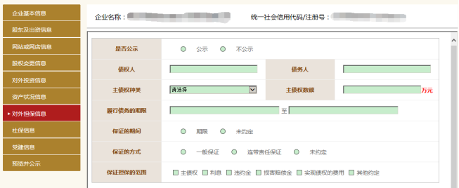 錄入債權人、債務人、主債權種類、主債權數(shù)額、履行債務的期限、保證的期間、保證的方式、保證擔保的范圍等對外擔保信息,如圖: