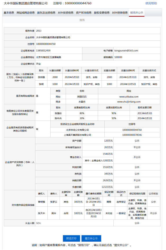 填寫以上信息完畢后進入信息總覽頁面,如需修正可返回進行修改。確認無誤后點擊“提交并公示”。最后年度報告數(shù)據(jù)將在信用信息公示系統(tǒng)進行公示。