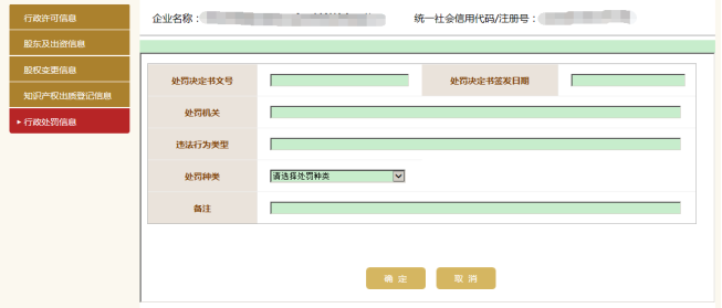 錄入處罰機關、處罰決定書文號、處罰決定書簽發(fā)日期、違法行為類型、處罰種類等信息,如圖: