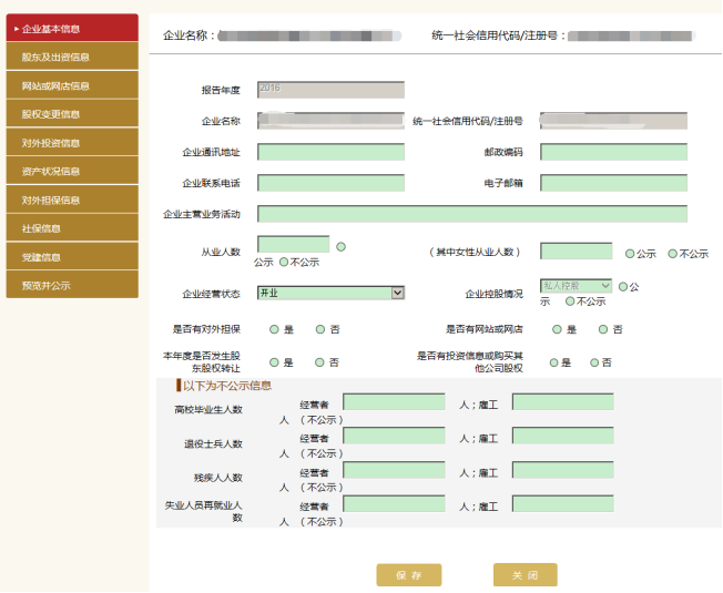 ★年報填錄信息分為“基本信息”、“股東及出資信息”、“網(wǎng)站或網(wǎng)店信息”、“股權變更信息”、“對外投資信息”、“資產狀況信息”、“對外擔保信息”、“社保信息”、“黨建信息”、“預覽并公示”9個標簽頁,默認顯示“基本信息”頁面。