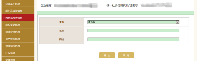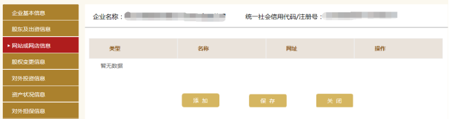★對于存在網(wǎng)站或網(wǎng)店信息的企業(yè),點擊“添加”按鈕,按提示逐一錄入相關網(wǎng)站或網(wǎng)店名稱、以及網(wǎng)址,見下圖:
