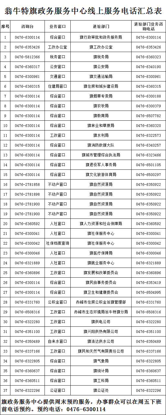 為全面做好我旗政務(wù)服務(wù)工作,打造更優(yōu)營商環(huán)境,為辦事群眾提供高效便捷的服務(wù),現(xiàn)將翁牛特旗政務(wù)服務(wù)中心各業(yè)務(wù)部門咨詢電話進(jìn)行公布,請廣大市民朋友收藏備用。