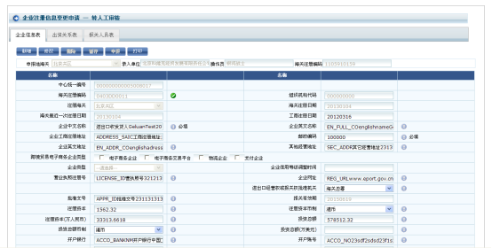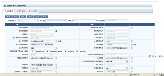 錄入:企業(yè)注冊信息包含三部分:企業(yè)信息表、投資關(guān)系表和報(bào)關(guān)人員表,通過點(diǎn)擊各表的選項(xiàng)卡可跳轉(zhuǎn)到相應(yīng)界面,點(diǎn)擊菜單后系統(tǒng)默認(rèn)顯示為當(dāng)前登錄企業(yè)的企業(yè)信息表界面。在該界面中可以查看到企業(yè)當(dāng)前的注冊基本信息,界面顯示的字段分為灰色只讀項(xiàng)和帶