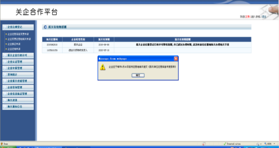 僅有報(bào)關(guān)企業(yè)和特殊監(jiān)管區(qū)域“雙重身份”企業(yè)可以提交注冊登記許可各項(xiàng)申請。當(dāng)企業(yè)在注冊登記許可各項(xiàng)申請界面發(fā)起申請業(yè)務(wù)時(shí),系統(tǒng)會(huì)對(duì)企業(yè)的經(jīng)營類別進(jìn)行判斷。如不是報(bào)關(guān)企業(yè)和特殊監(jiān)管區(qū)域“雙重身份”企業(yè),系統(tǒng)會(huì)給予提示。
