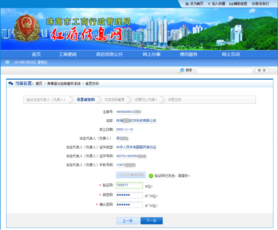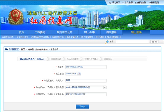 第一步:錄入注冊(cè)號(hào),成立日期,法人資料,點(diǎn)擊【下一步】按鈕。