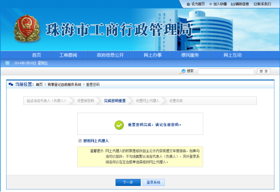 第三步:完成密碼重置,可以重新登錄系統(tǒng),點(diǎn)擊【登錄系統(tǒng)】,如需授權(quán)網(wǎng)上代理人,選中授權(quán)網(wǎng)上代理人,點(diǎn)擊【下一步】。