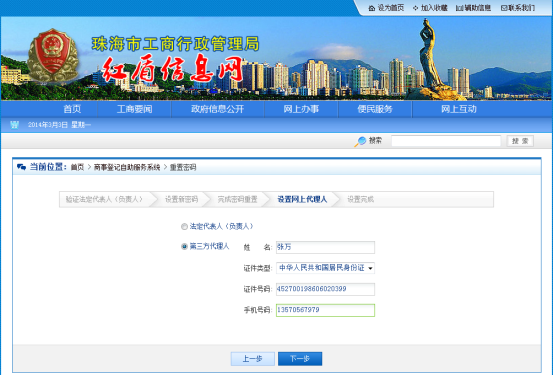 第四步:設(shè)置網(wǎng)上代理人,可以是法定代表人或者是第三方代理人。默認(rèn)是法定代表人,如果選第三方代理人需要填寫代理人姓名、身份證號(hào)、手機(jī)號(hào)碼。