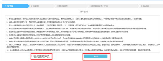 納稅人可根據(jù)自身業(yè)務(wù)辦理需求,對用戶須知的內(nèi)容進行判斷,只有在勾選無異議時,方可進入下一步。
