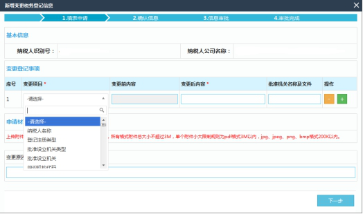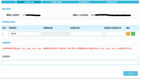 五、據(jù)實填寫“變更原因”,并上傳需要的附列資料,完成后點擊[下一步]。