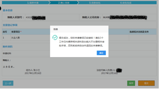 六、選擇[上一步],回到變更登記申請表填寫界面,可以修改信息;選擇[保存],在變更稅務(wù)登記界面形成草稿,草稿可以進(jìn)行修改、刪除;選擇[提交],申請事項將提交至主管稅務(wù)機(jī)關(guān),根據(jù)變更項目的不同生成相應(yīng)的提示信息。