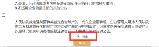 若符合簡易注銷條件,勾選已閱,點(diǎn)擊確定
