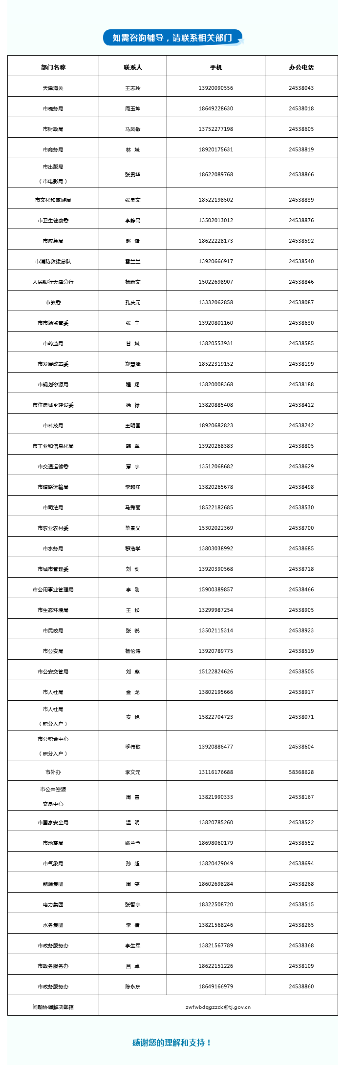 天津市政務(wù)服務(wù)中心受理時(shí)間:工作日 上午:9:00 至 12:00 下午:13:30 至 17:00 伏天上午:9:00 至 12:00下午:14:30 至 17:00;辦理地點(diǎn) :天津市河?xùn)|區(qū)紅星路79號(hào) 天津市政務(wù)服務(wù)中心;天津?市政務(wù)服務(wù)辦聯(lián)系電話:022-24538368