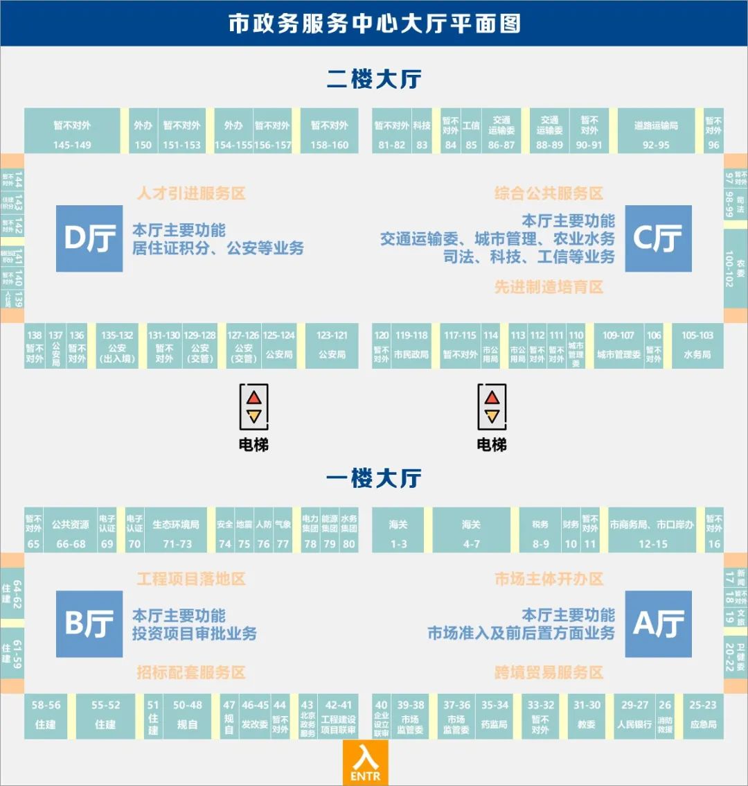 大廳分為ABCD四個(gè)廳。其中A廳主要功能是辦理市場(chǎng)準(zhǔn)入及前后置方面業(yè)務(wù),B廳主要辦理投資項(xiàng)目審批業(yè)務(wù),C廳主要辦理交通運(yùn)輸委、城市管理、農(nóng)業(yè)水務(wù)、司法、科技、工信等業(yè)務(wù),D廳主要辦理居住證積分、公安等業(yè)務(wù)。