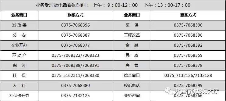 郟縣行政服務(wù)中心辦事大廳各窗口預(yù)約咨詢電話,衛(wèi)生局窗口咨詢電話:0375-7068390,房管局窗口咨詢電話:0375-7068351