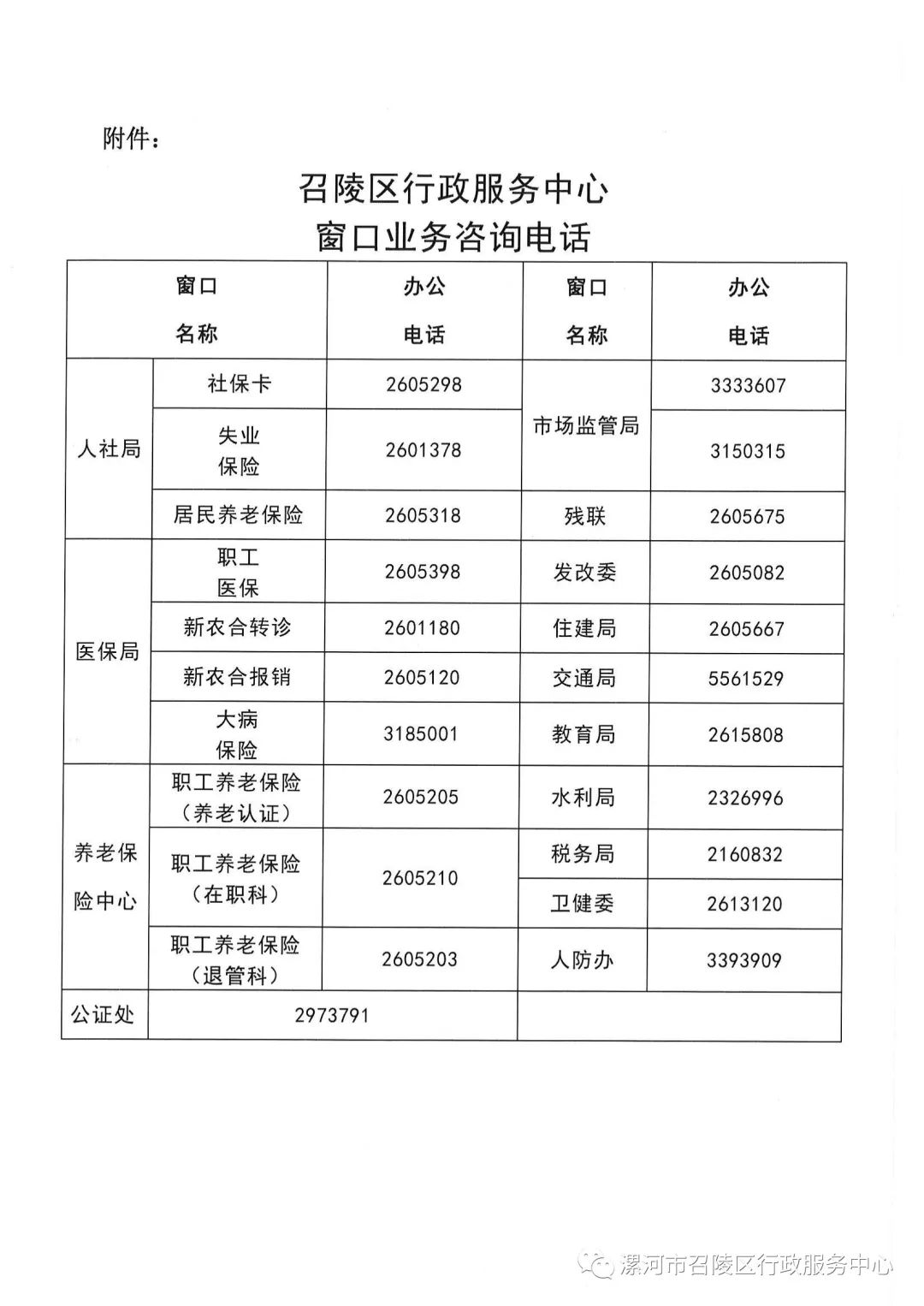 漯河市召陵區(qū)行政服務(wù)中心辦事大廳窗口預(yù)約咨詢電話,人社局(社??ǎ?窗口咨詢電話:2605298,稅務(wù)局窗口咨詢電話:2160832,人社局(居民養(yǎng)老)窗口咨詢電話:2605318,市場(chǎng)監(jiān)管局窗口電話:3150315