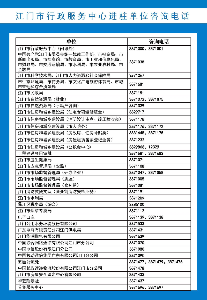 江門(mén)市各政務(wù)服務(wù)大廳咨詢(xún)電話統(tǒng)一咨詢(xún)電話:0750-12345江門(mén)市行政服務(wù)中心大廳咨詢(xún)電話:0750-3871000、0750-3871001蓬江區(qū)行政服務(wù)中心大廳咨詢(xún)電話:0750-3833038、0750-3833039