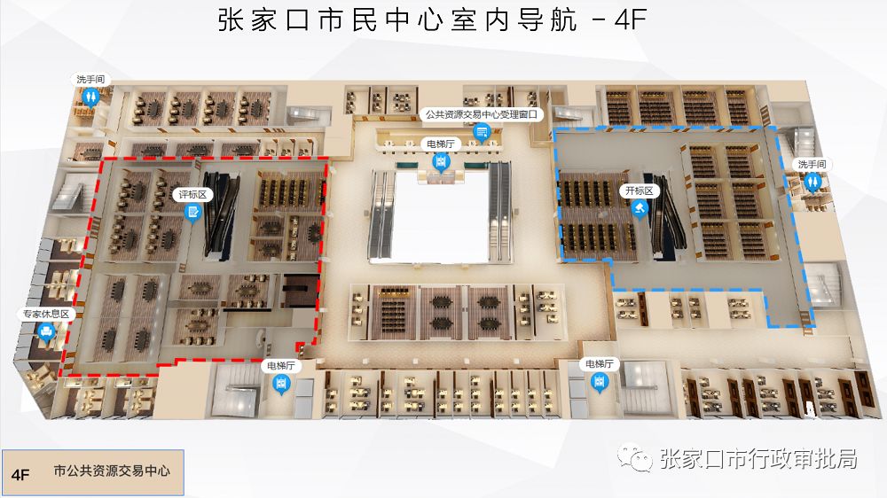 四層設(shè)置公共資源窗口服務(wù)區(qū)、開(kāi)標(biāo)服務(wù)區(qū)、評(píng)標(biāo)服務(wù)區(qū)。