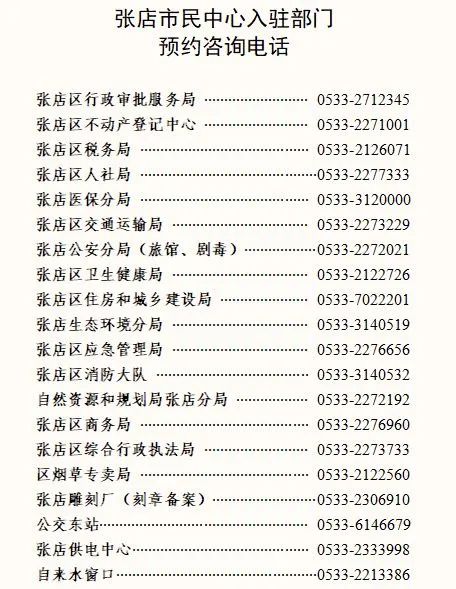 淄博市張店區(qū)政務(wù)服務(wù)中心辦事大廳窗口咨詢電話,張店區(qū)行政審批服務(wù)局(0533-2712345)張店區(qū)不動產(chǎn)登記中心(0533-2271001)國家稅務(wù)總局淄博市張店區(qū)(0533-2272310)社保綜合業(yè)務(wù)咨詢(業(yè)務(wù)預(yù)約辦理)(0533-2277333)淄博市醫(yī)療保障局張店分局(0533-3120000)