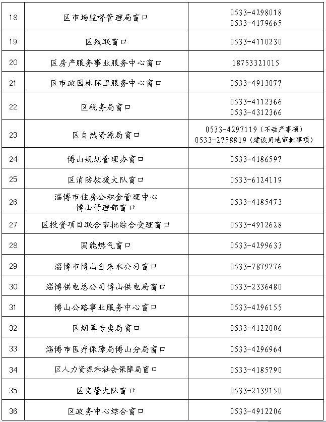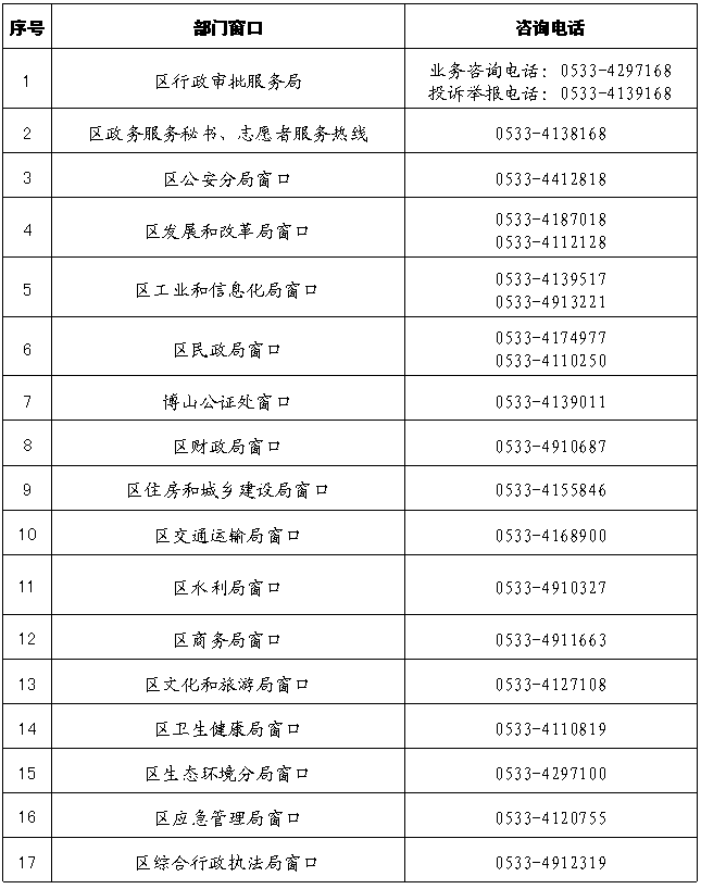 博山區(qū)中服務(wù)中心辦事大廳各窗口咨詢電話