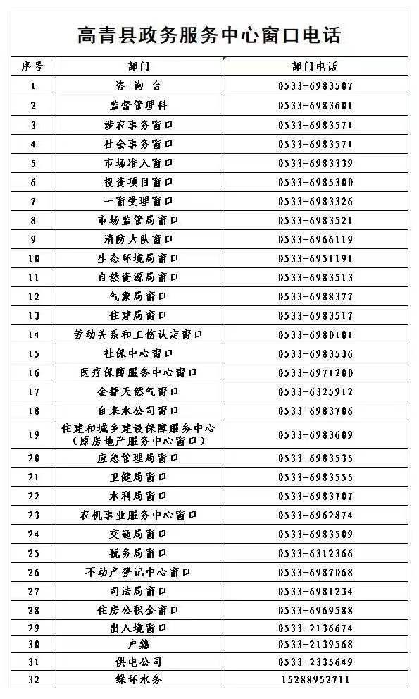 高青縣政務(wù)服務(wù)中心辦事大廳各窗口辦事咨詢電話,咨詢電話:05336983507,投訴電話:05336983601,經(jīng)濟(jì)發(fā)展科窗口電話:05336983571,社會(huì)事務(wù)科窗口咨詢電話:05336983571