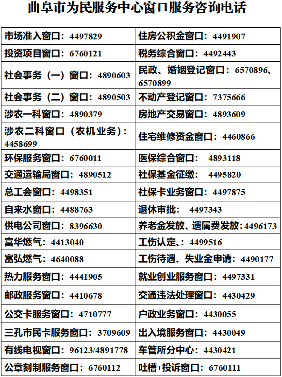 曲阜市政務(wù)服務(wù)中心(為民服務(wù)中心)辦事窗口咨詢電話,曲阜?市發(fā)展和改革局窗口咨詢電話:0537-4498325,曲阜?市住房和城鄉(xiāng)建設(shè)局窗口咨詢電話:0537-4496759,曲阜?市教育和體育局窗口咨詢電話:0537-4442677