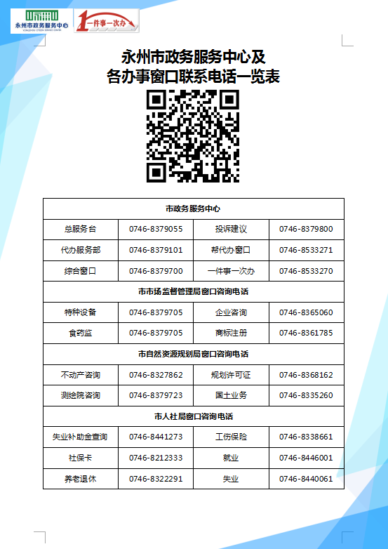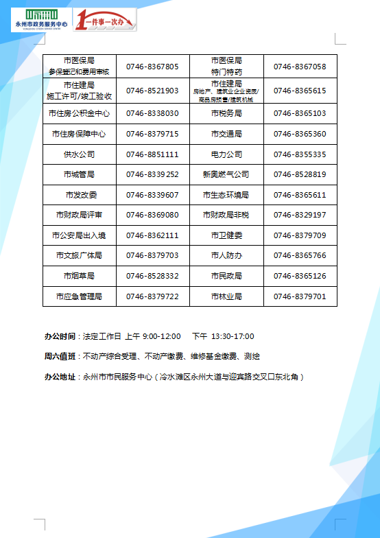 永州市政務(wù)服務(wù)中心地址:湖南省永州市永州大道與迎賓大道交匯處東北角市民服務(wù)中心,聯(lián)系電話:0746-8521903,寶貴時(shí)間:法定工作日:上午9:00—12:00,下午13:30—17:00