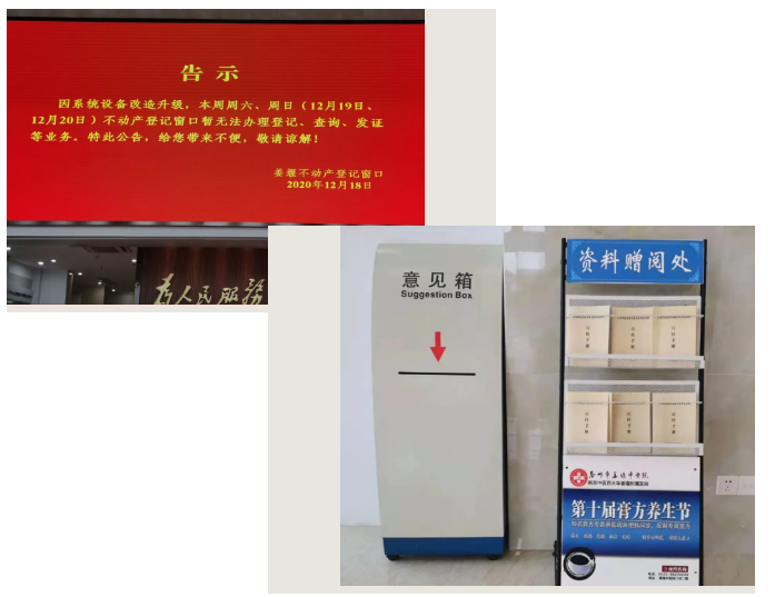 配有LED電子顯示屏、資料贈(zèng)閱處就相關(guān)政策法規(guī)、通知等內(nèi)容展示給辦事群眾。